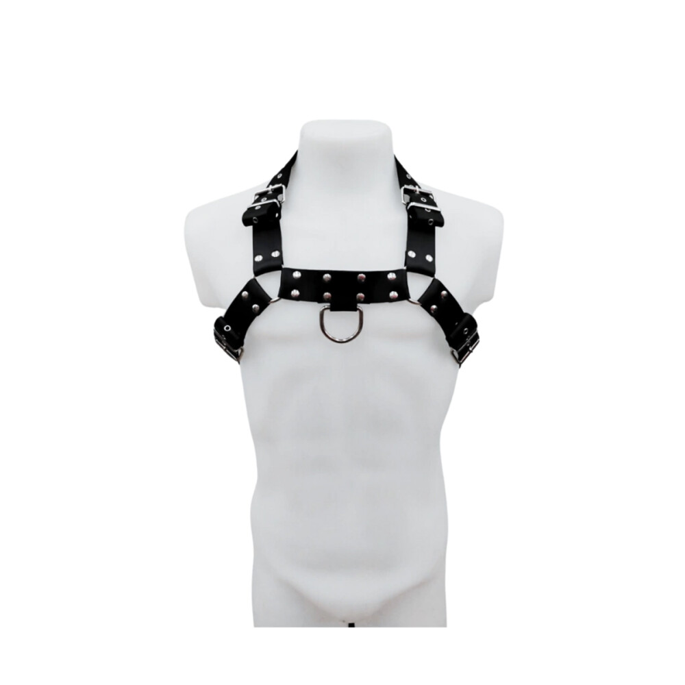 40 Descubre el Arnés Pectoral Masculino "D", regulable y de cuero vegano. ¡Hazte notar con estilo! Adquiérelo ahora y mejora tu look.